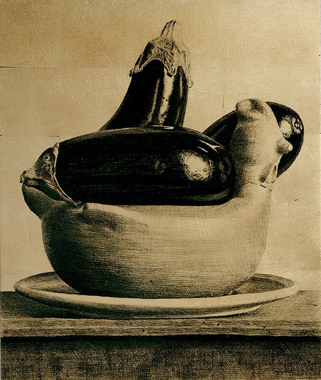 Faire un portrait de la résidence d'artistes de Moly-Sabata en dessinant des fruits et des légumes dans les céramiques des potiers reçus en résidence. Les tableaux leurs sont dédicacés.